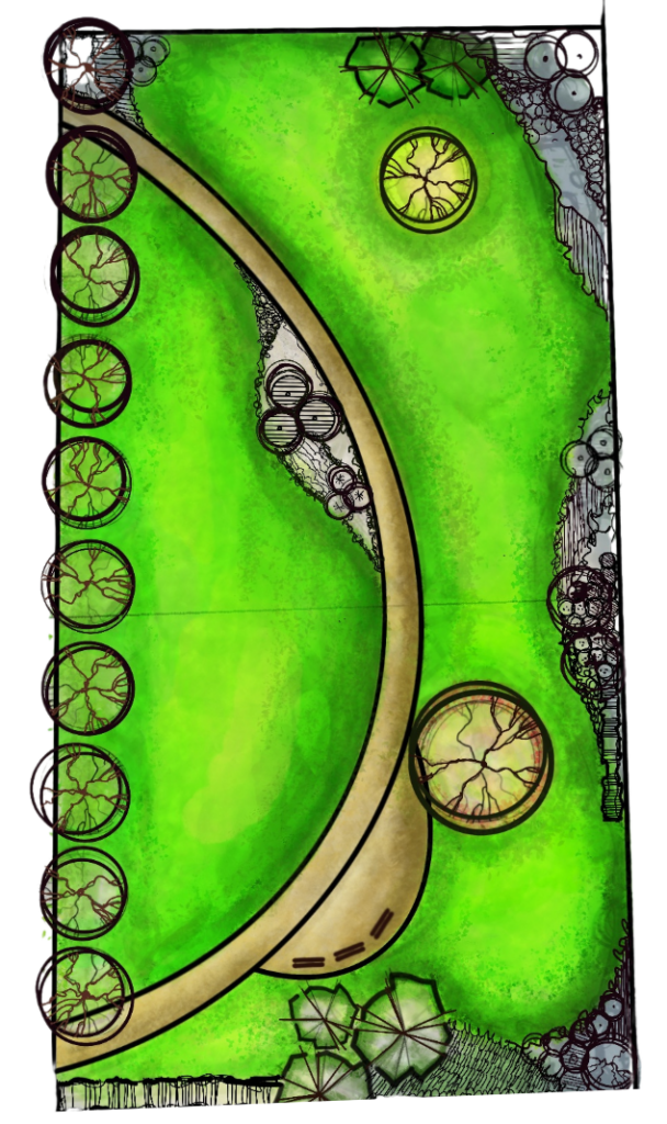 Tento návrh moderní rodinné zahrady o velké rozloze, plynule propojuje obytné prostory domu s venkovním posezením u bazénu a relaxační zónou s vířivkou. Centrální volná travnatá plocha je určena pro aktivity a v zadní části navazuje na otevřené ohniště a užitkovou zahradu se skleníkem.
