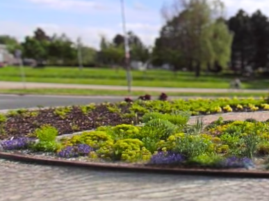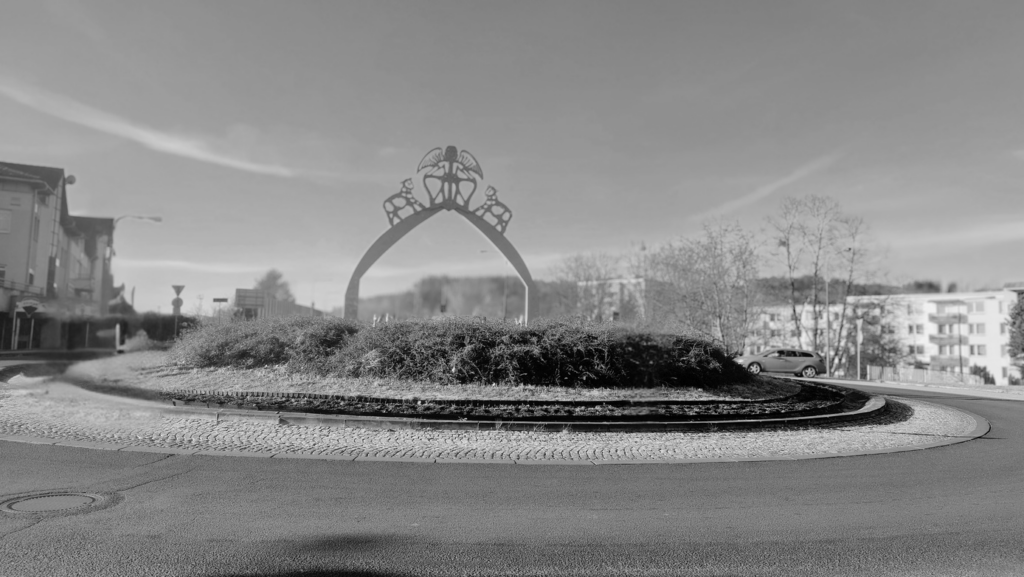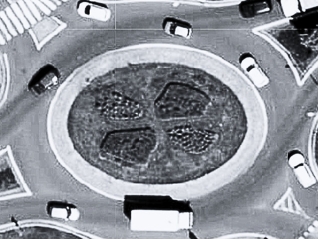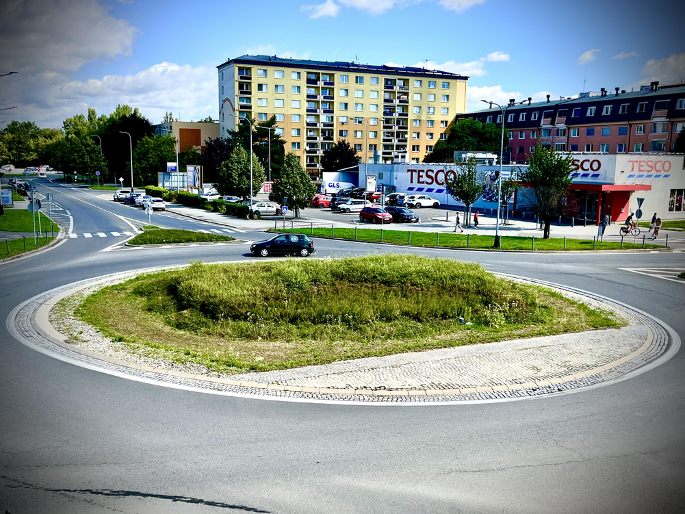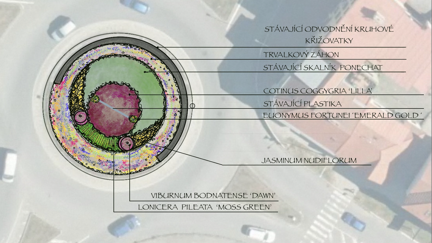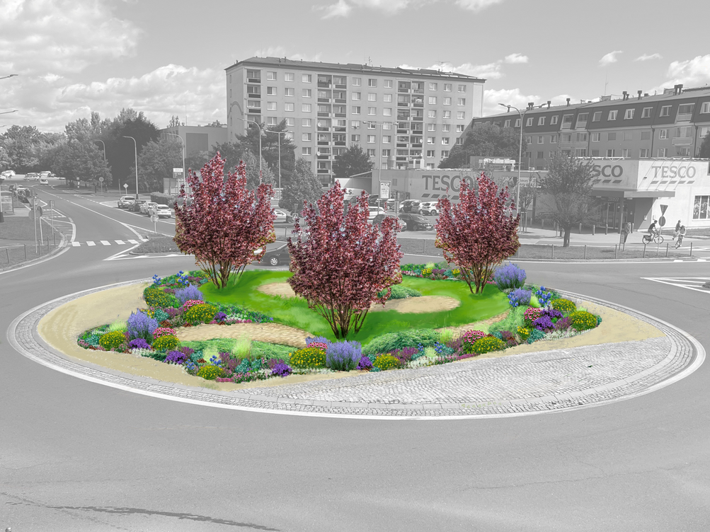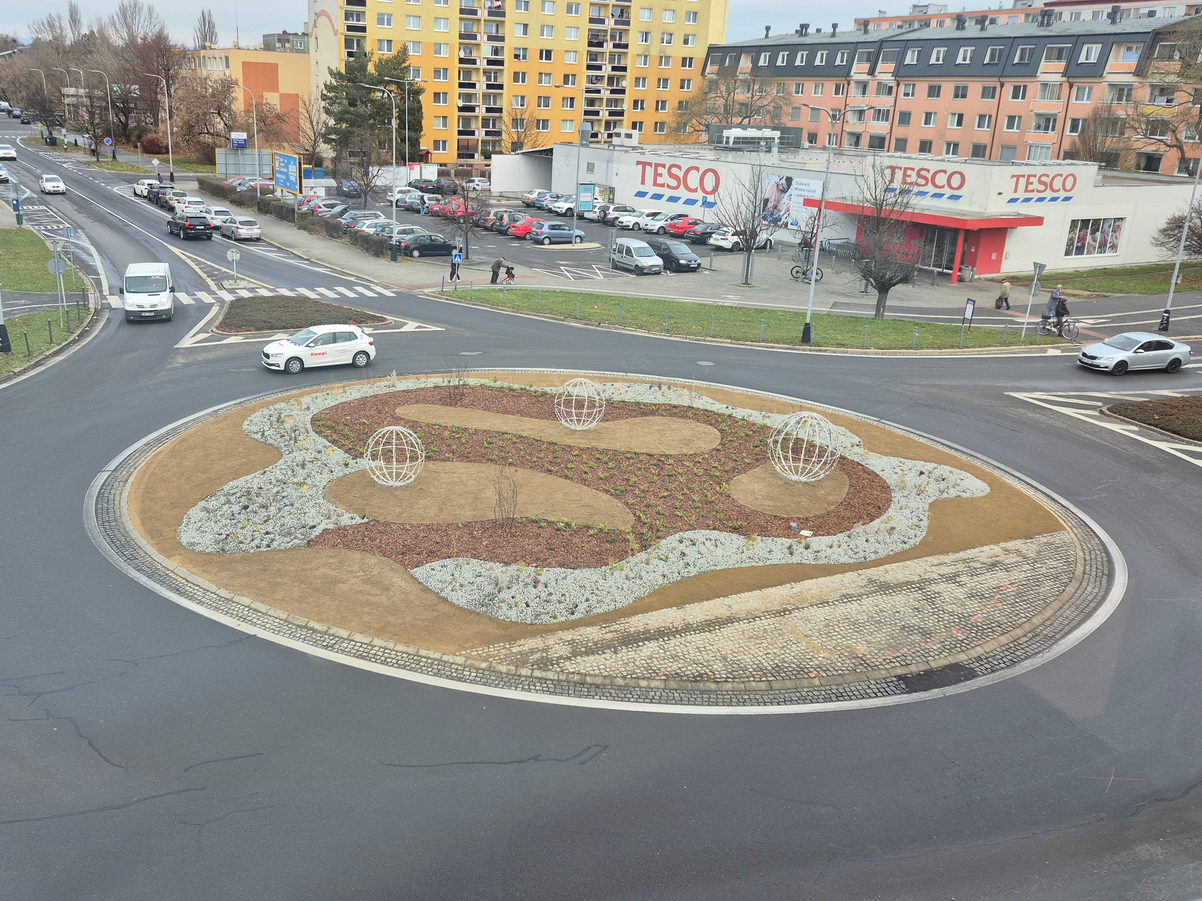 Významný kruhový objezd s logem města, navržený s ohledem na minimální nároky na údržbu a důstojnou reprezentaci města.