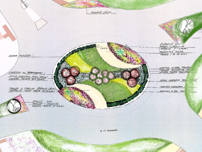 Kruhový objezd v blízkosti Lidové školy umění evokuje malířskou paletu, kombinuje technickou funkčnost s uměleckým přesahem a sezónní proměnlivostí. Tento projekt byl realizován pod záštitou TsmPr.